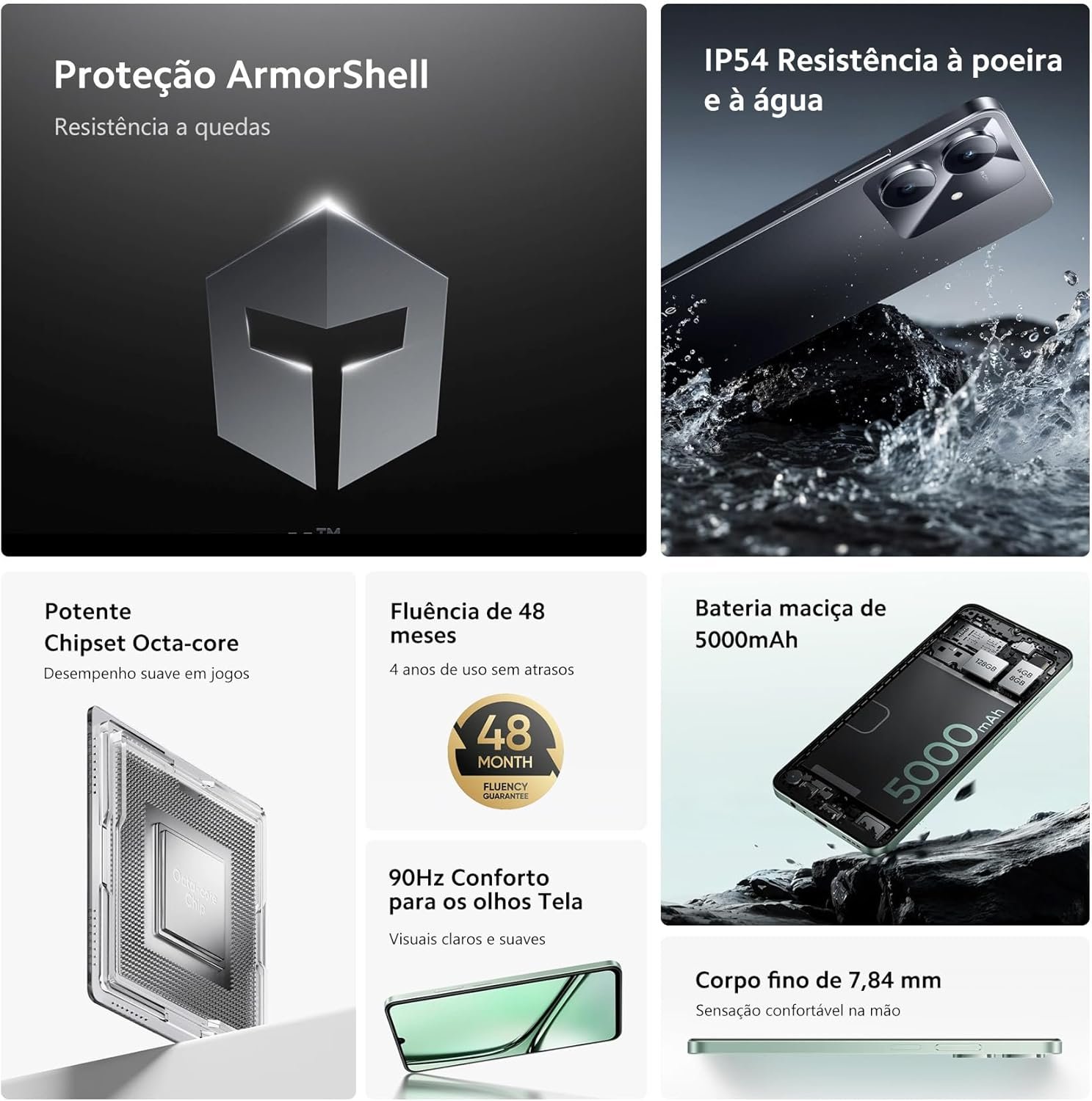 O Smartphone Realme Note 60x é uma excelente escolha da marca realme, com 64 GB de armazenamento e 3 GB de RAM. Sua tela de 6,74 polegadas com taxa de atualização de 90Hz oferece uma experiência visual incrível, enquanto a bateria de 5000mAh garante longa duração. Destaque para a proteção ArmorShell que traz mais resistência ao aparelho.